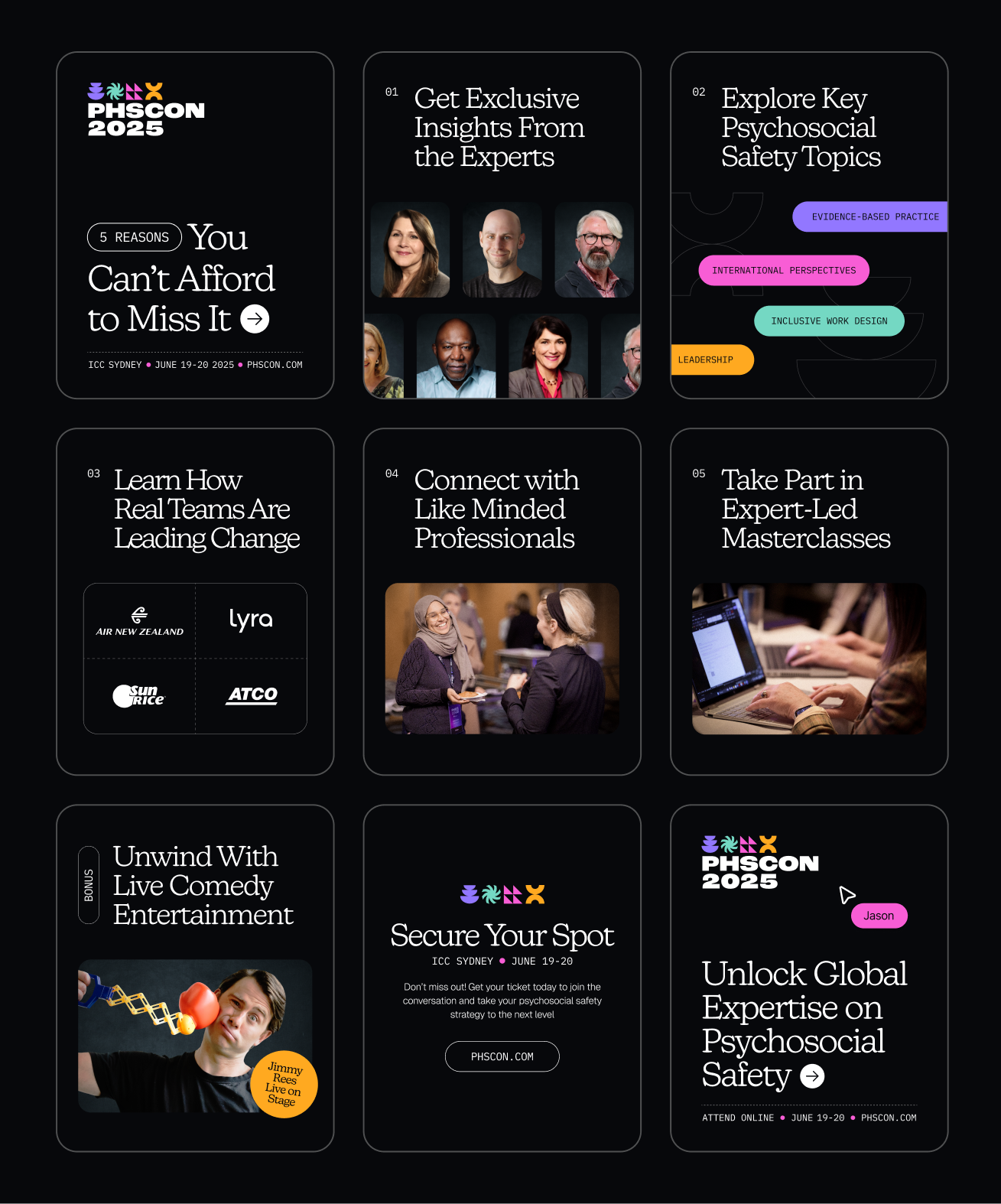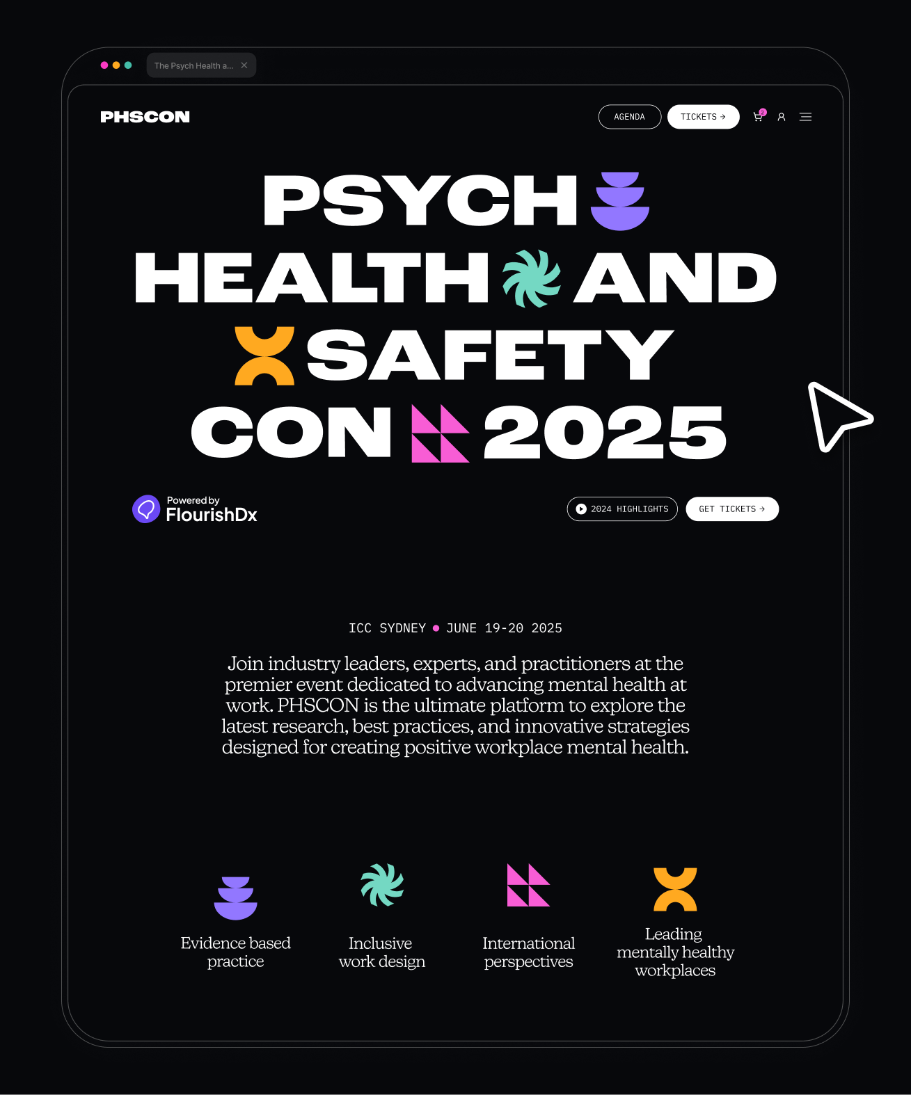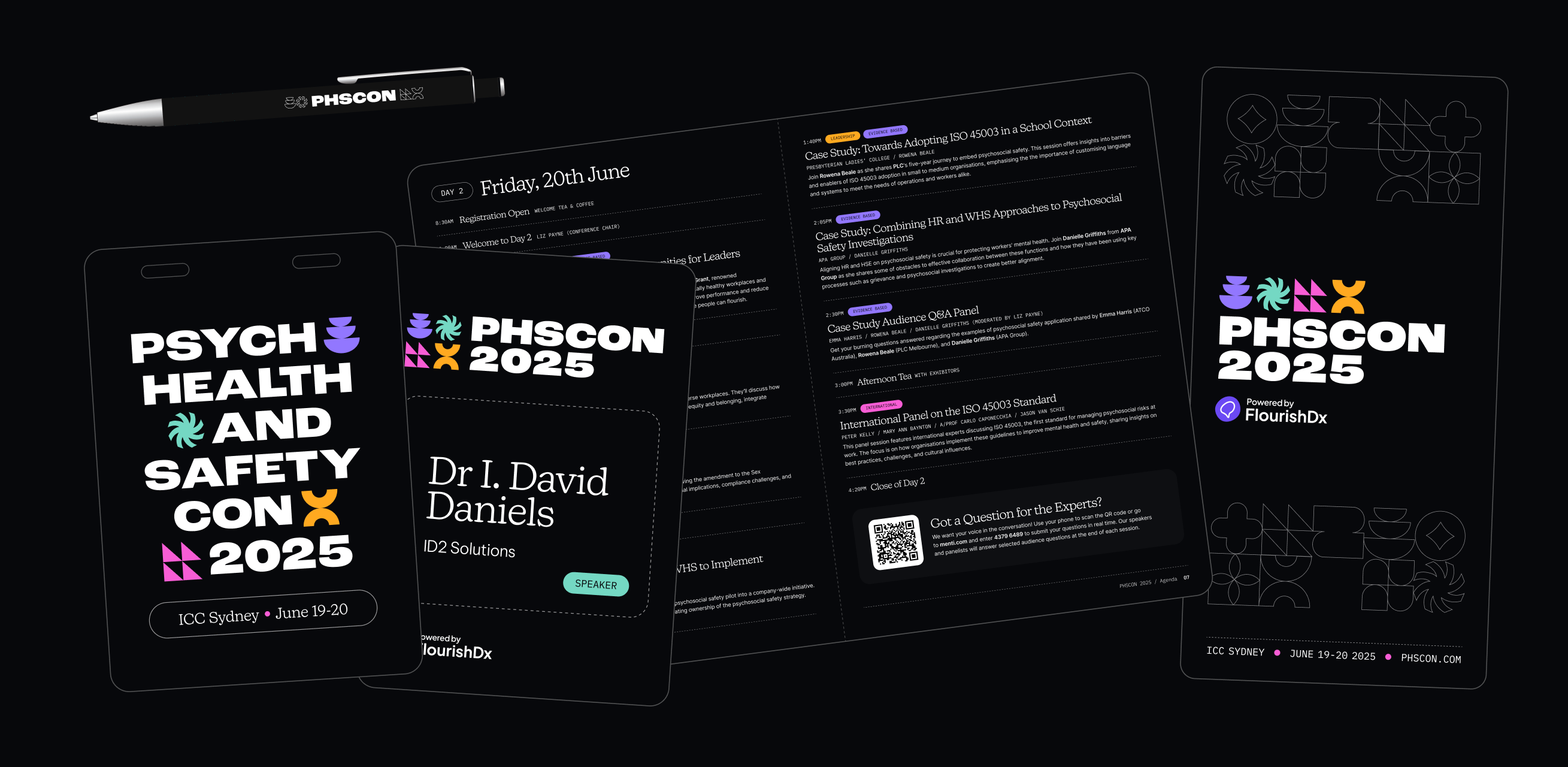FlourishDx delivers psychosocial safety solutions to organisations across Australia and internationally. Each year, the company hosts the Psych Health & Safety Conference (PHSCON)—a flagship event bringing together global experts, practitioners, and industry leaders.As Senior Designer, I led the full brand design for PHSCON 2025, creating a distinct but connected identity that aligned with the FlourishDx master brand while giving the conference its own bold, energetic personality.